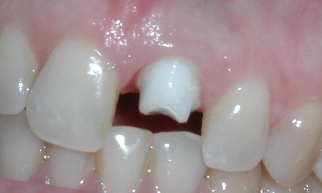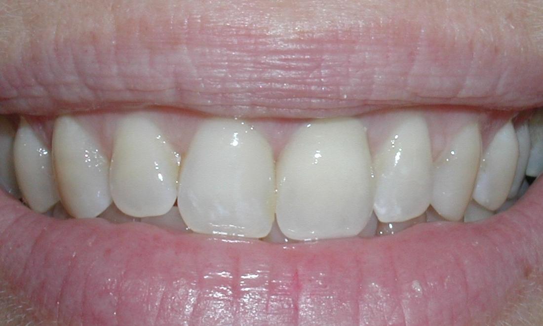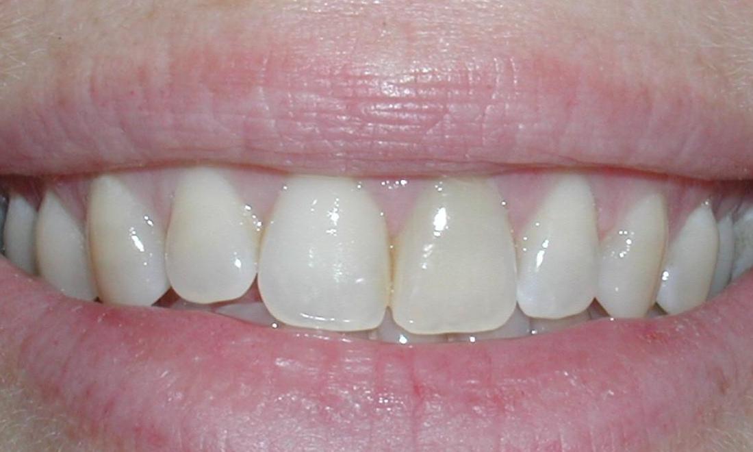 Before: Here is a nice example of an immediate temporized dental implant. This lady fractured her front left tooth and it appears dark. It was removed by an oral surgeon, and the implant was placed right away. This keeps the gum around the tooth intact, so it will not dissolve away.