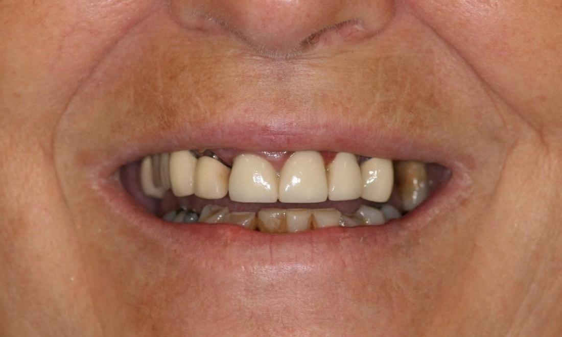 This woman had decayed and missing teeth and periodontal disease with an irregular smile. She chose to have the teeth removed and implants placed. We delivered temporary bridges the same day the teeth were removed. She never went without teeth. Three months later we fabricated the final porcelain bridges. The new teeth helped her social life and self esteem.